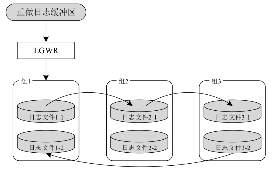 Oracle实例在运行中会产生大量日志信息,这些日志信息首先被记录在SGA的重做日志缓冲区中,当发生提交命令,或者重做日志缓冲区的信息满1/3,或者日志信息存储超过3 s时,LGWR进程就将日志信息从重做日志缓冲区中读出并将其写入日志文件组中序号较小的文件中,在一个日志文件组中被写满后接着写入另外一组中。当LGWR进程将所有的日志文件都写过一遍之后,它将再次转向第一个日志文件组重新覆盖,如图2.17所示。当LGWR进程写满一个日志文件组而转向写另外一组时,称之为日志切换。