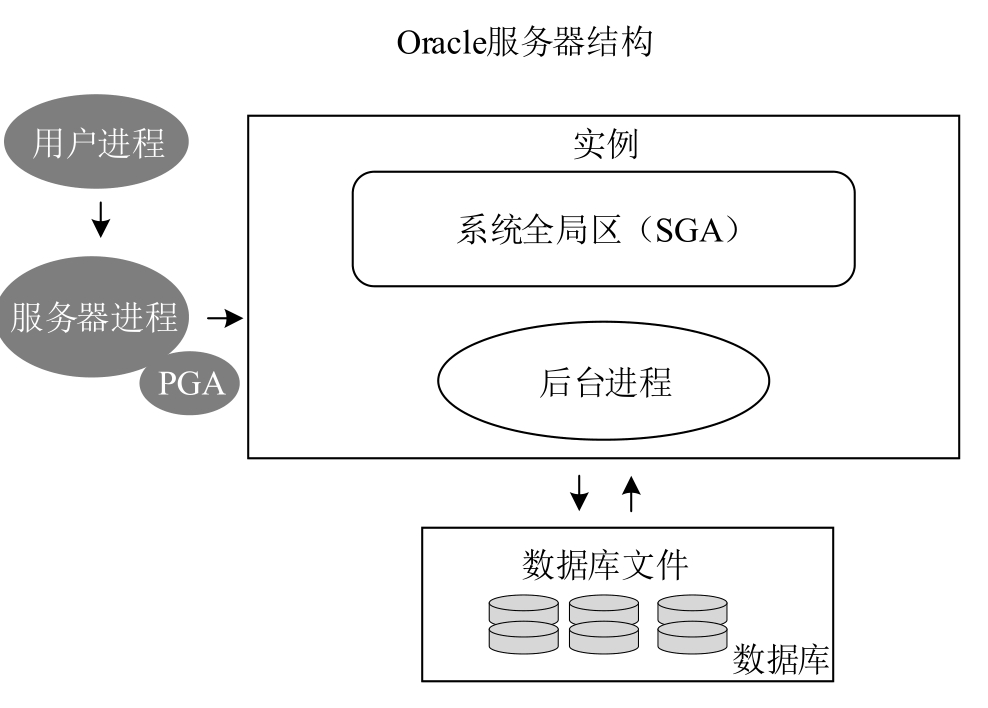 Oracle服务器主要由实例、数据库、程序全局区(PGA)和前台进程组成,如图2.15所示。