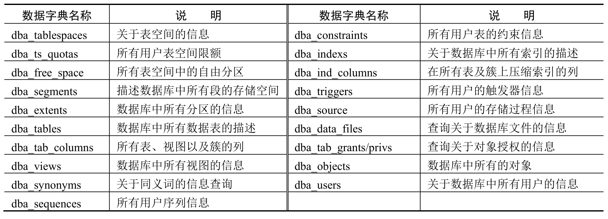 基本数据字典主要包括描述逻辑存储结构和物理存储结构的数据表,另外,还包括一些描述其他数据对象信息的表,如dba_views、dba_triggers、dba_users等。基本数据字典及其说明如表2.1所示。