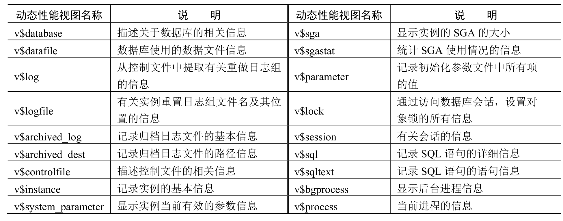 Oracle系统内部提供了大量的动态性能视图,之所以说是“动态”,是因为这些视图的信息在数据库运行期间会不断地被更新。动态性能视图以v$作为名称前缀,这些视图提供了关于内存和磁盘的运行情况,用户只能进行只读访问而不能修改它们。常用的动态性能视图及其说明如表2.2所示。