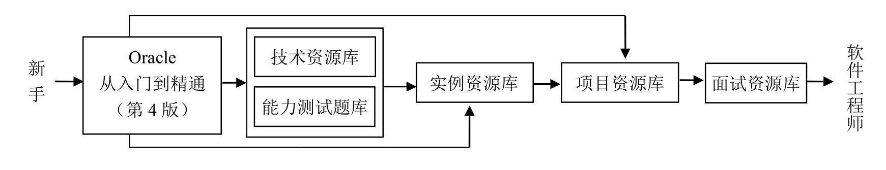在学习《Oracle从入门到精通(第4版)》一书时,随书附配资源包提供了“Java开发资源库”系统,可以帮助读者快速提升编程水平和解决实际问题的能力。本书和“Java开发资源库”配合学习的方式如图1所示。