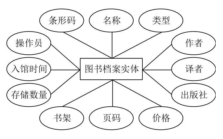 在E-R模型中,实体用矩形表示,矩形内注明实体的命名。实体名常用以大写字母开头的有具体意义的英文名词来表示,联系名和属性名也采用这种方式。图1.2为一个图书档案的E-R图。