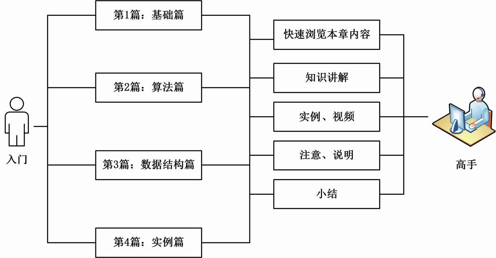 本书提供了从算法入门到成为算法设计高手所必需的各类知识,共分4篇,大体结构如下图所示。