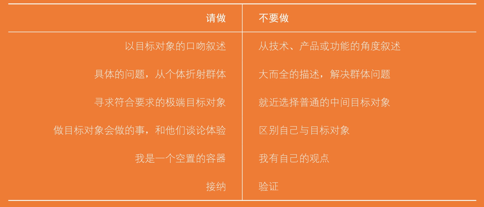设计师放空自我的揣测与预置,将用户的想法放到自己这一容器中,运用“共情力”共鸣他人。如表2-1所示,设计师要尽量做设身处地的感悟,来寻找深入人心的洞察。从设计对象的不满和需求、愿望和障碍、梦想和恐惧中探寻切入的缝隙,在物件、环境、制度之间剖析动态联系,捕捉涌现出的痛点。痛点,就是设计机会。