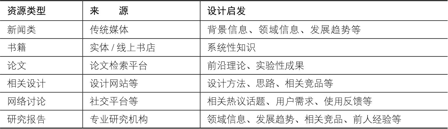 (2)确定资料来源。准备一个待解决问题清单,评估信息来源,不同的资源类型、来源将提供不同角度的启发,如表2-2所示。