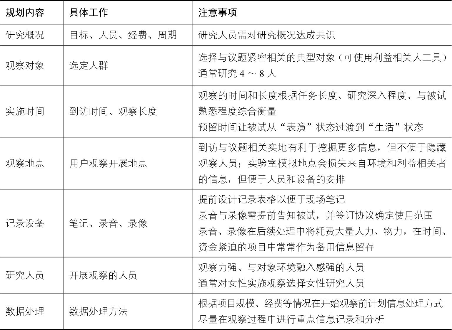 表2-3列出了在实施用户观察前研究团队需要讨论的内容以供参考,建议团队设计表格规划要做的前期准备内容、完成时间和对应的执行人员。