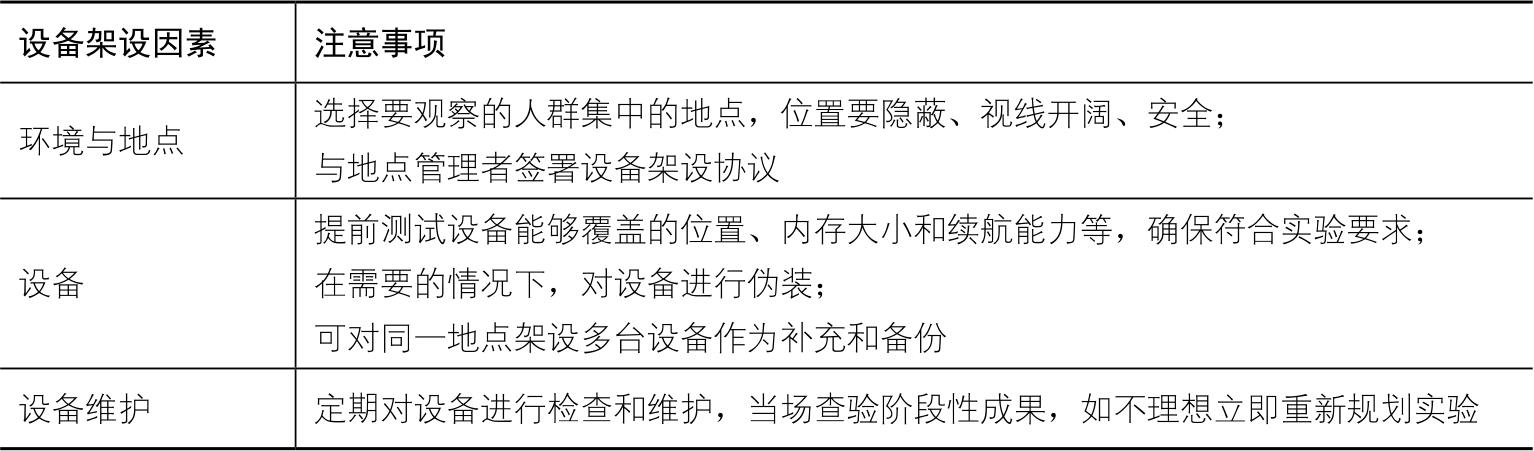 作为观察法的一种,隐蔽观察法总体流程与普通用户观察法相似,但在两个阶段要注意投入更多精力。一是在前期规划阶段,要精心设计观察设备及规划观察周期;二是在结果分析阶段,因为将处理大量的影像资料,需要预留更多时间进行图像分析。隐蔽观察中观察设备架设注意事项如表2-5所示。