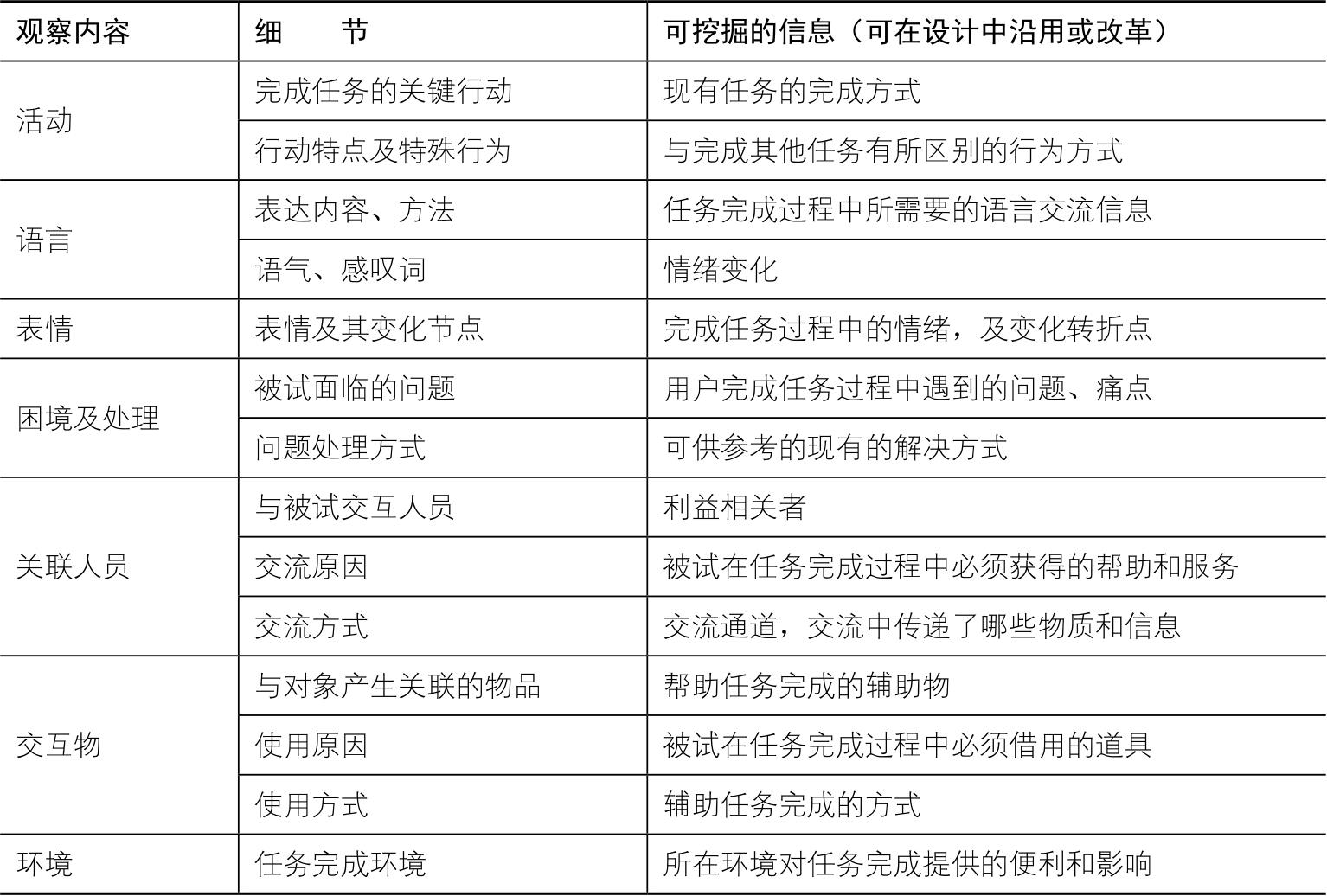 在实施用户观察时,可以对用户、相关人员和环境等信息进行多层次记录。表2-4列举了需要观察的内容、细节以及可挖掘的信息。使用者可以根据后续研究需要,选择最重要的部分进行现场记录,其他内容可以依靠信息手段回溯。