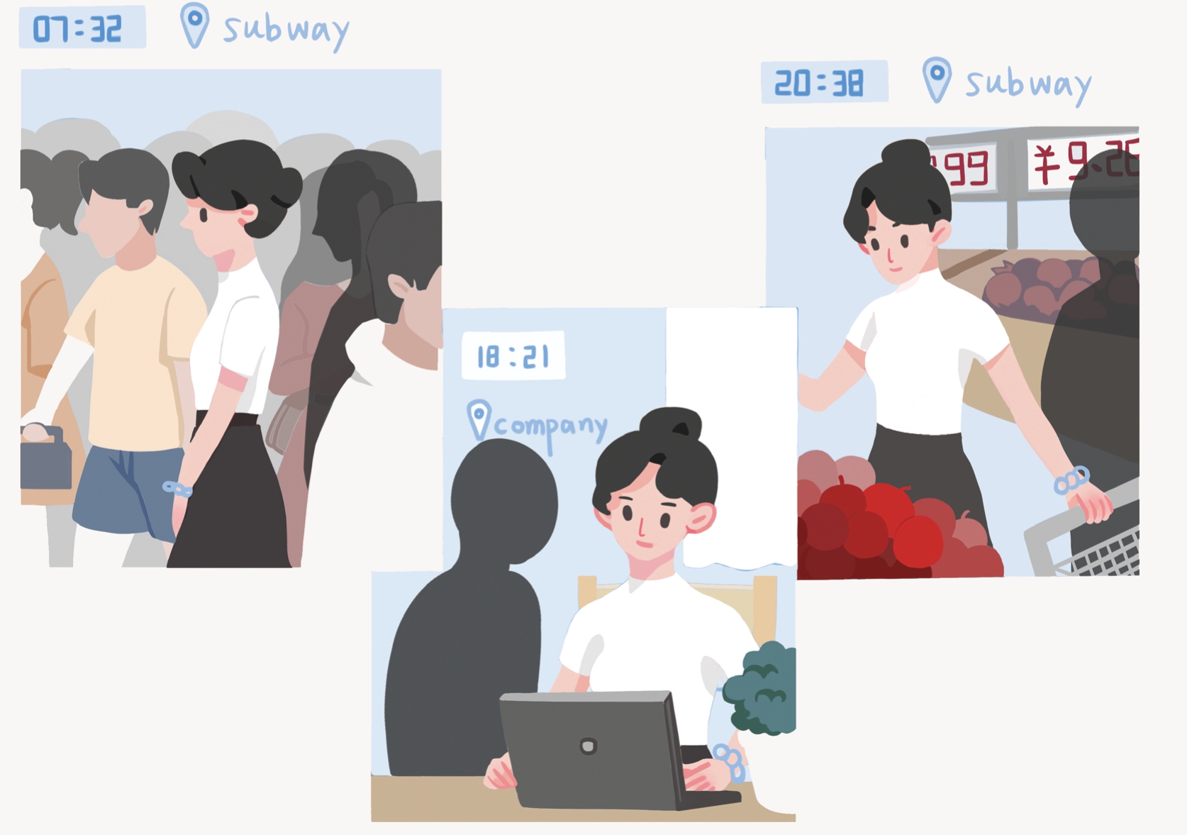 研究人员对一个上班族开展全天跟踪观察的情景:上班族在不同的时间点处于不同的场景中,研究者像影子一样观察她完成一系列连续的任务。
