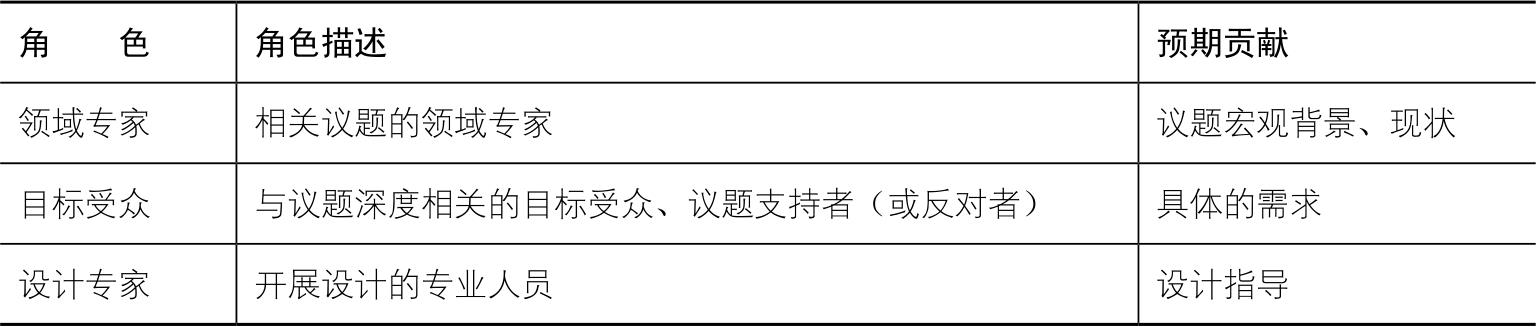 围绕议题确定焦点小组参会人员。如表2-9所示,一般我们会邀请6~8名参与者,每类角色2~3人。