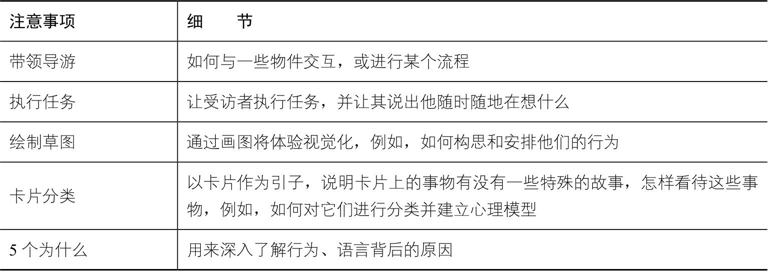 在访谈的过程中,可以使用非常多的工具来丰富访谈流程,激活谈话氛围等。表2-8列出了其中常用的部分方法。
