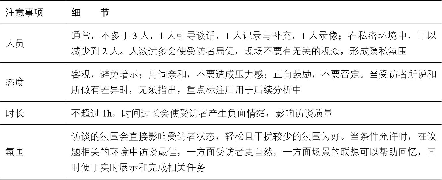 和用户观察一样,用户访谈也可以分为非结构性和结构性两种。非结构性访谈更注重效率,无须太多的准备。在结构性访谈中,前期准备与结构性用户观察法类似,需要提前计划研究概况、观察对象、实施时间和地点、记录设备、研究人员、数据处理方式等内容,具体的规划要点可参考观察法的准备内容和注意事项。