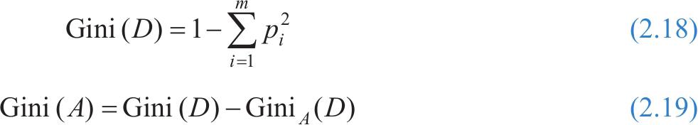 其中, p i 表示数据集 D 中属于类别 C i 的概率, m 表示总的类别数量。Gini( A )表示经过一次划分之后Gini指数的降低程度,也即是不纯度的降低,并且选择最大化降低不纯的属性进行划分。