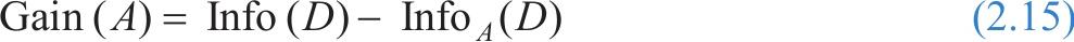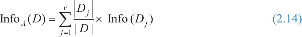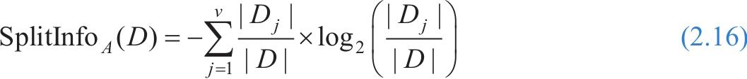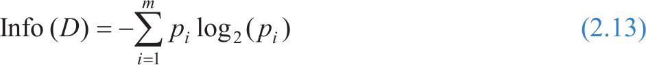 其中, p i 是 D 中任意元组属于类 C i 的概率,用类别 C i 的元组个数除以元组总数的值来估计。使用以2为底数的对数是因为信息是用二进制编码的,Info( D )也表示识别 D 中元组的类别号所需要的平均信息量,因此该式也可称为 D 的熵。利用这个公式可表示数据集 D 的混乱程度,数据集 D 中数据类别越多,该值越大,信息量越大。