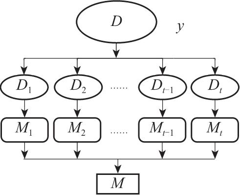 具体的步骤如图2.8所示,首先从一个数据集 D 中有放回地采样多个数据子集{ D 1 , D 2 ,…, D t },然后对每一个数据子集 D i 训练出一个分类器模型 M i ,最后结合多个分类器模型得出最终的模型 M 。最后可以通过平均值、投票等方式来实现多个模型的组合。根据计算,这种有放回的采样方法最终会有63.2%的样本出现在采样集中,而剩下的36.8%是一次都没有被采样的样本,可以作为验证集对模型的泛化性能进行估计。