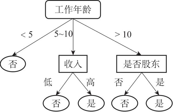 例如,在一个判断公司员工是否为管理层的分类问题中,数据集为收集到的各员工的基本信息(如工作年龄、收入、是否为公司股东等),通过对数据集中的属性值进行划分可以产生一颗具有树形结构的决策流程图。如图2.7所示,决策树的每一个非树叶节点对应一个属性的测试,每一个分支表示一次决策,每个分支产生两个或更多的子树,每个叶子节点表示最终的分类判断。决策树的判断过程就是执行从根节点到叶子节点的流程,给定一个测试点 x ,按照决策树流程中的属性进行判断,直到达到叶子节点输出最终的预测结果。