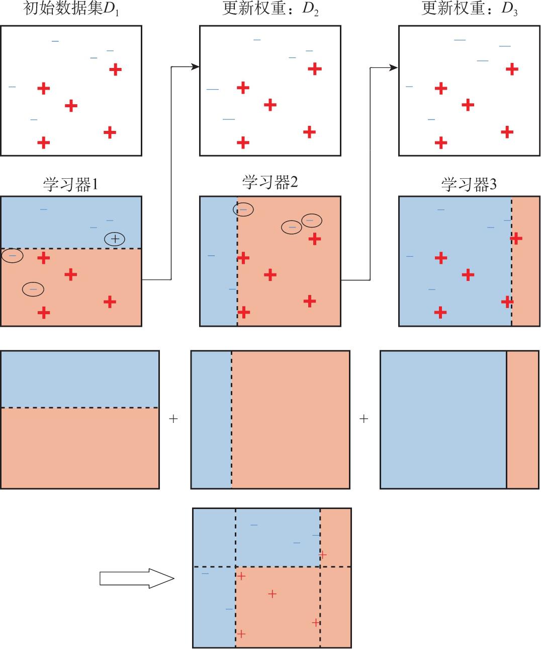 具体实现过程如图2.9所示,首先使用各种不同的学习算法(不限于决策树)训练得到不同的学习器,称为基学习器,每个基学习器代表一个弱规则。然后依次使用弱分类器对数据进行测试,在学习器1中有3个数据点预测错误,那么在下一轮的学习器2中,这些数据点将赋有更高的权重,再对学习器2中的错误预测点增加权重代入下一个学习器,以此迭代,直到达到最大的精度。于是就可以将几个简单的弱学习器构成一个规则强大的学习器。