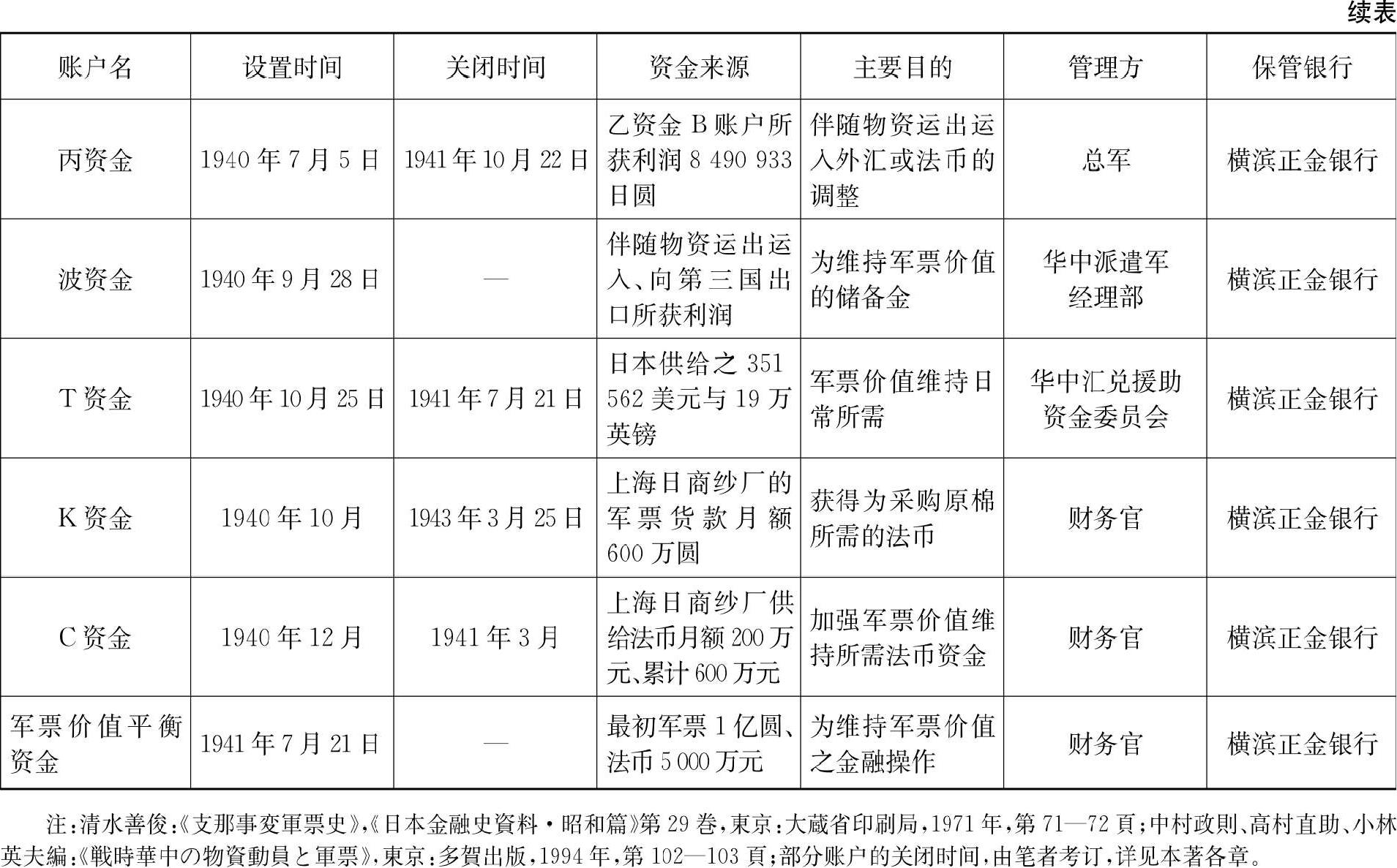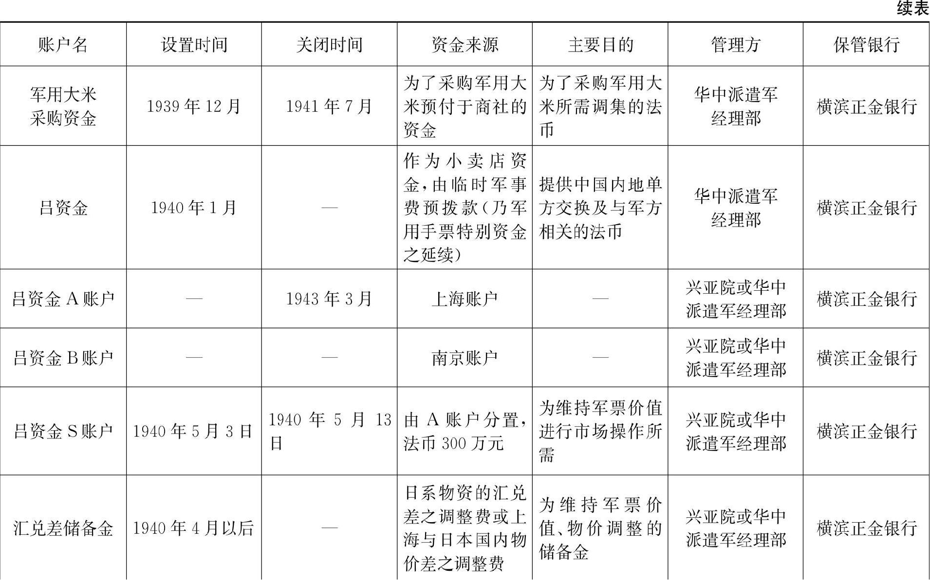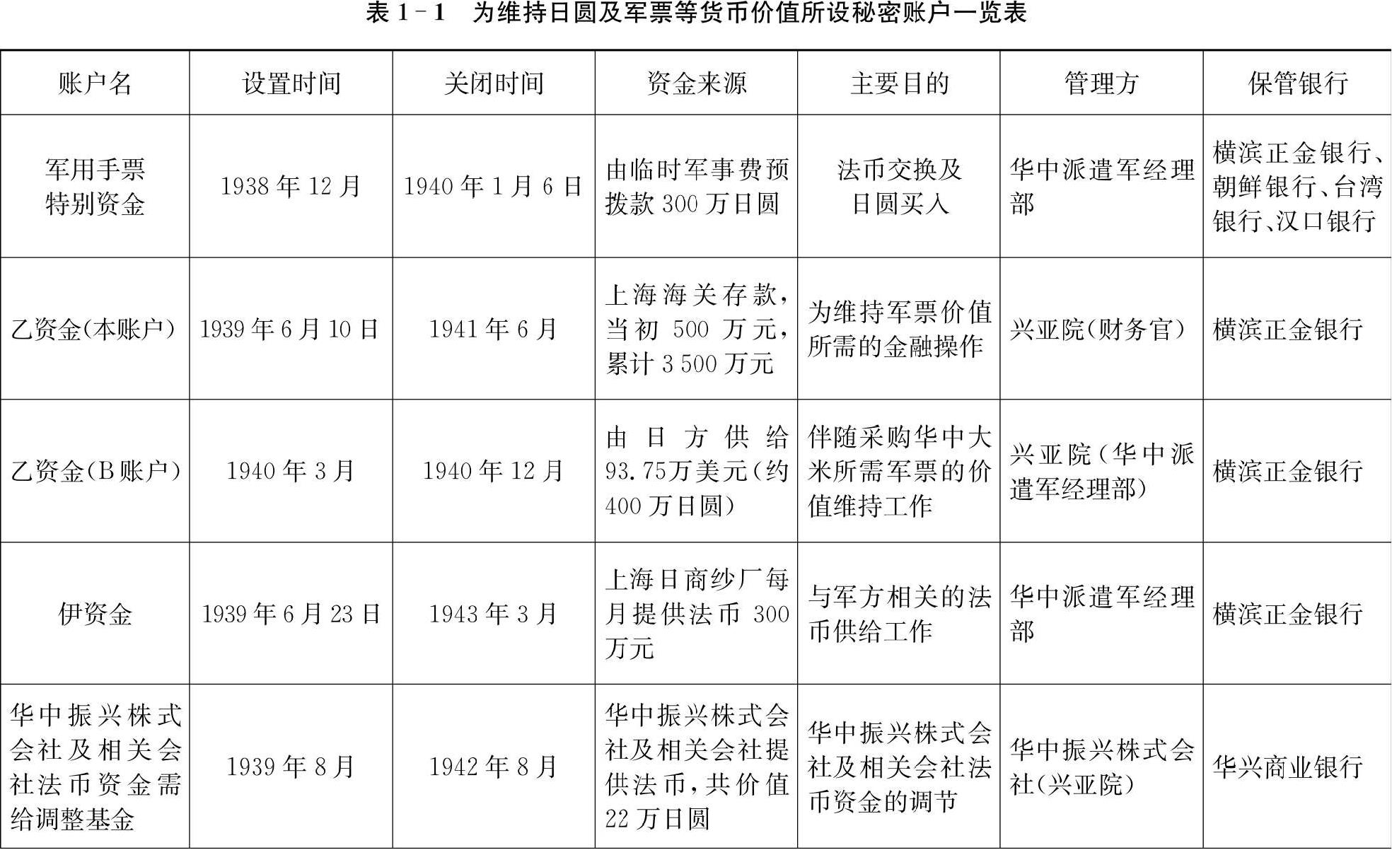 为了维持日圆对法币的汇率,阻止日圆的跌势,日本军政当局采取多种方案,在横滨正金银行等日资金融机构中设置各种秘密账户,在维持日圆价值的同时,扩大军票的流通范围,从而使军票得以彻底代替日本银行券,完成华中沦陷区内日系通货的统一。这些秘密账户的情况,如表1-1所示。
