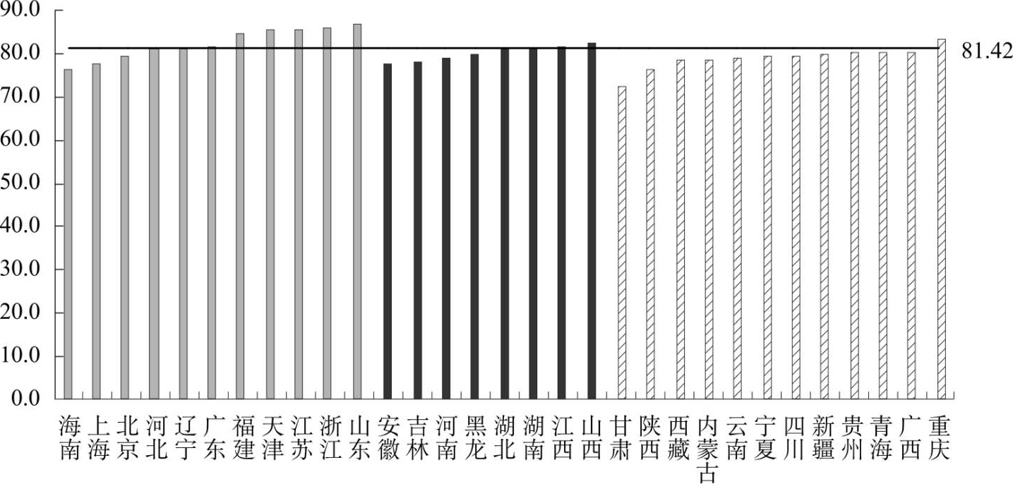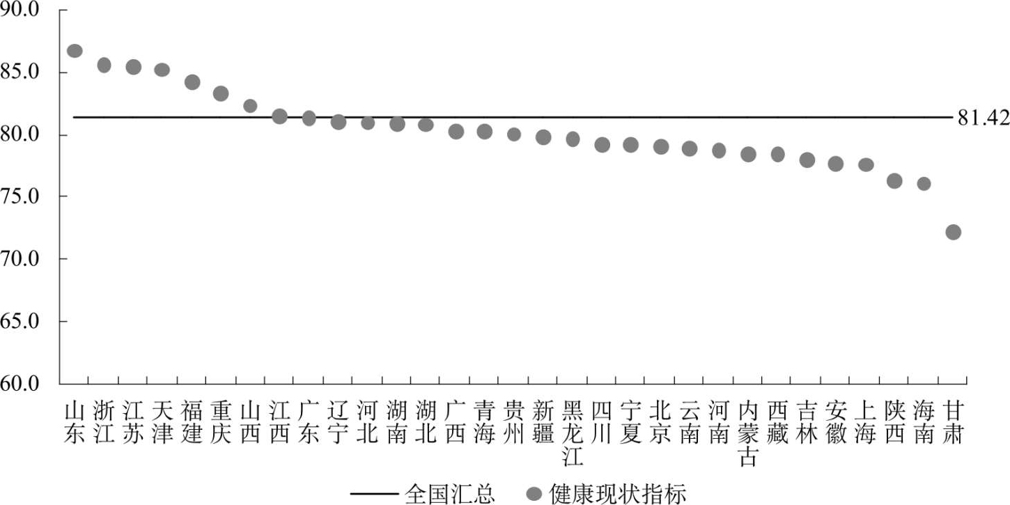分别计算全国31个省区市健康现状指数得分,见图2-1。由图2-1可知,健康现状指标得分高于81.4分的有天津、山西、江苏、浙江、福建、山东、重庆七个省份,甘肃得分最低(72.3分)。