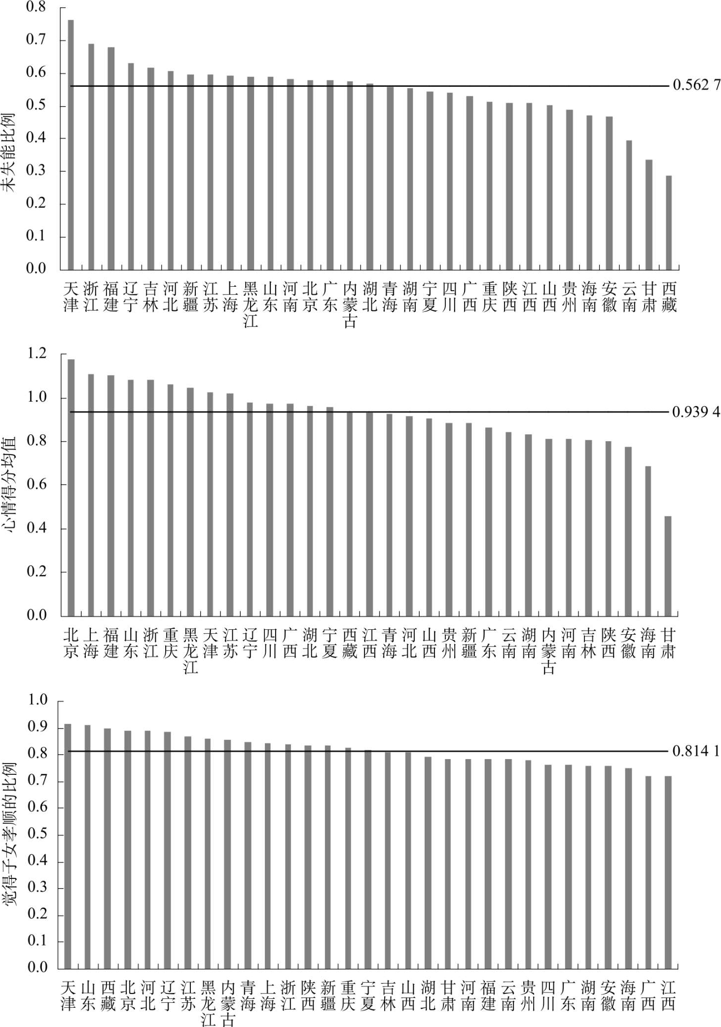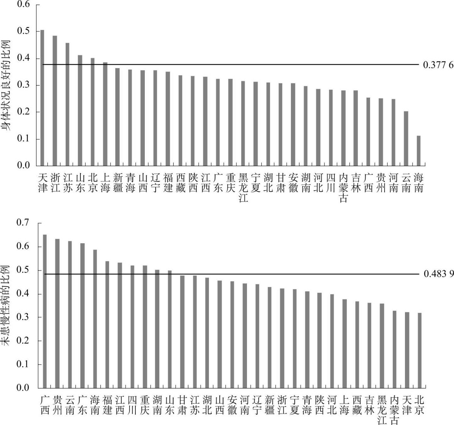 相较于城市,农村地区经济基础较差,基础设施不完善,医疗资源相对较差,这是影响农村老龄人口健康现状的外部原因。本书所研究的31个省份中,城市老年人健康自评均好于农村老年人,这可能与城市地区医疗资源较好、城市老龄人口对于自身健康状况更加关注有关。这与以往的研究结论一致,如郭磊运用欧洲五维健康量表法(EQ-5D-5L)和集中指数法对山东省城乡居民的健康状况及其公平性进行分析,研究发现在健康自评方面,城市居民的健康水平要高于农村居民(郭磊等,2020)。