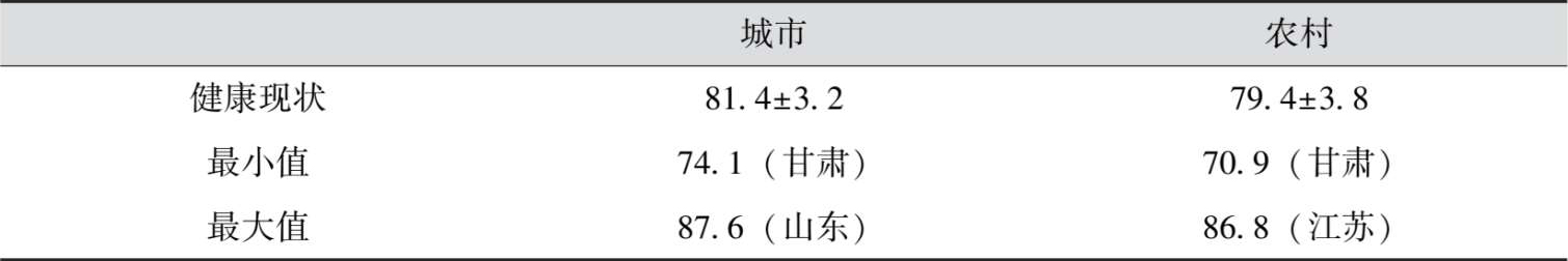 表2-1对31个省份的健康现状指数得分进行了城乡比较。总体来看,城市老年人的健康现状得分要高于农村老年人,说明各省份在推动积极老龄化、提升健康现状方面仍有较大的城乡差距,农村应进一步改善老龄人口的健康状况。甘肃城市和农村健康现状得分在31个省份中排在最后,说明甘肃在积极老龄化的健康现状方面发展得不好,需要进一步改善。