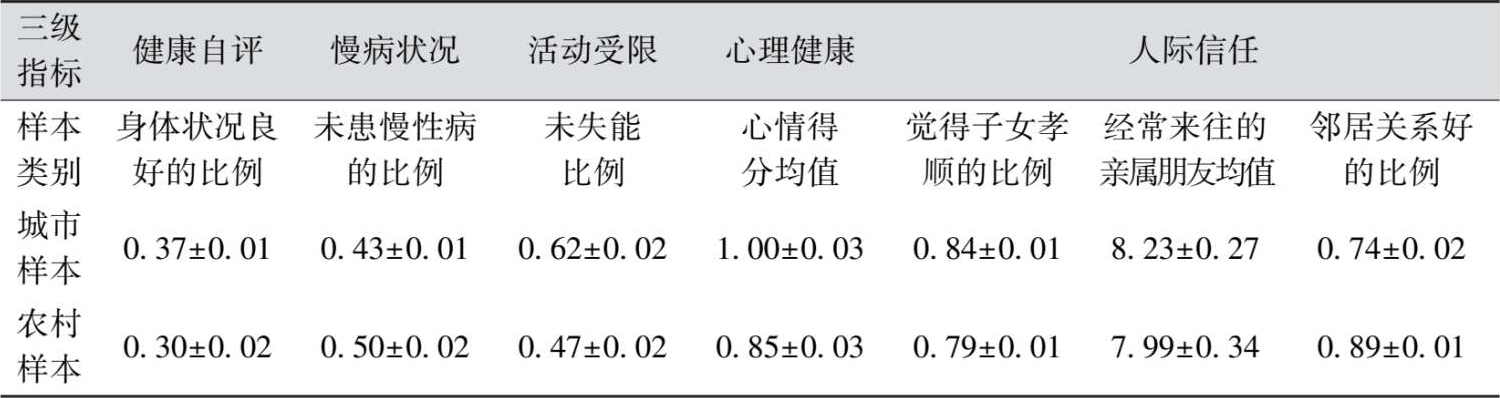 健康现状指标下各个三级指标的城乡差异分析如表2-3所示。除经常来往的亲属朋友均值外,城市老年人和农村老年人身体状况良好的比例、未患慢性病的比例、未失能比例、心情得分均值、觉得子女孝顺的比例、邻居关系好的比例均有差异。其中,城市老年人身体状况良好的比例、未失能比例、心情得分均值、觉得子女孝顺的比例、经常来往的亲属朋友比例,均高于农村老年人;而农村老年人未患慢性病的比例和邻居关系好的比例则高于城市老年人。