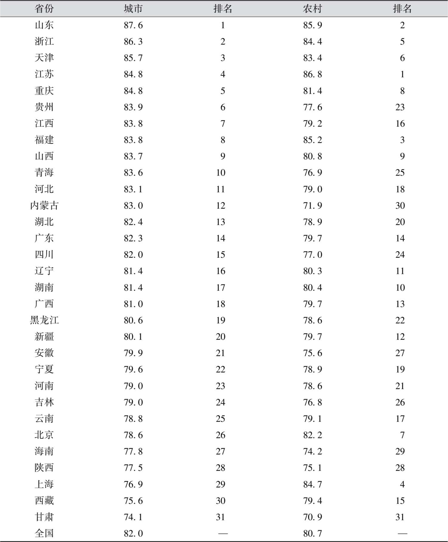 表2-2 各省份健康现状指数的城乡得分及排名情况