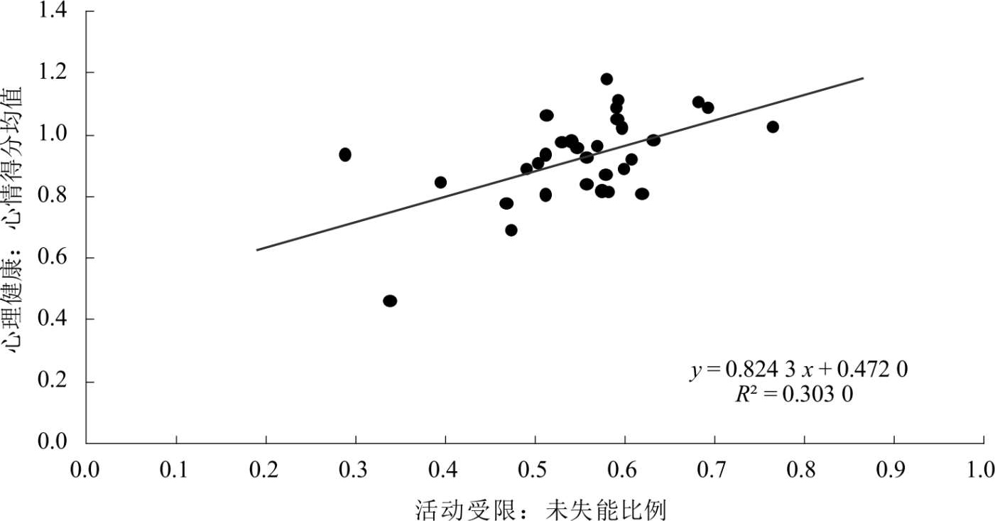 心理健康与活动受限呈显著的正相关关系(见图2-5),未失能比例越高,心理健康得分也越高。有研究发现,慢性病患者同时患抑郁症等心理疾病的比例相对较高(阎红,2019),这主要是因为长期的疾病状况、活动受限等导致心理疾病的发生(伏干,2018)。因此通过改善老年人活动受限情况也可以进一步促进老年人的心理健康发展。