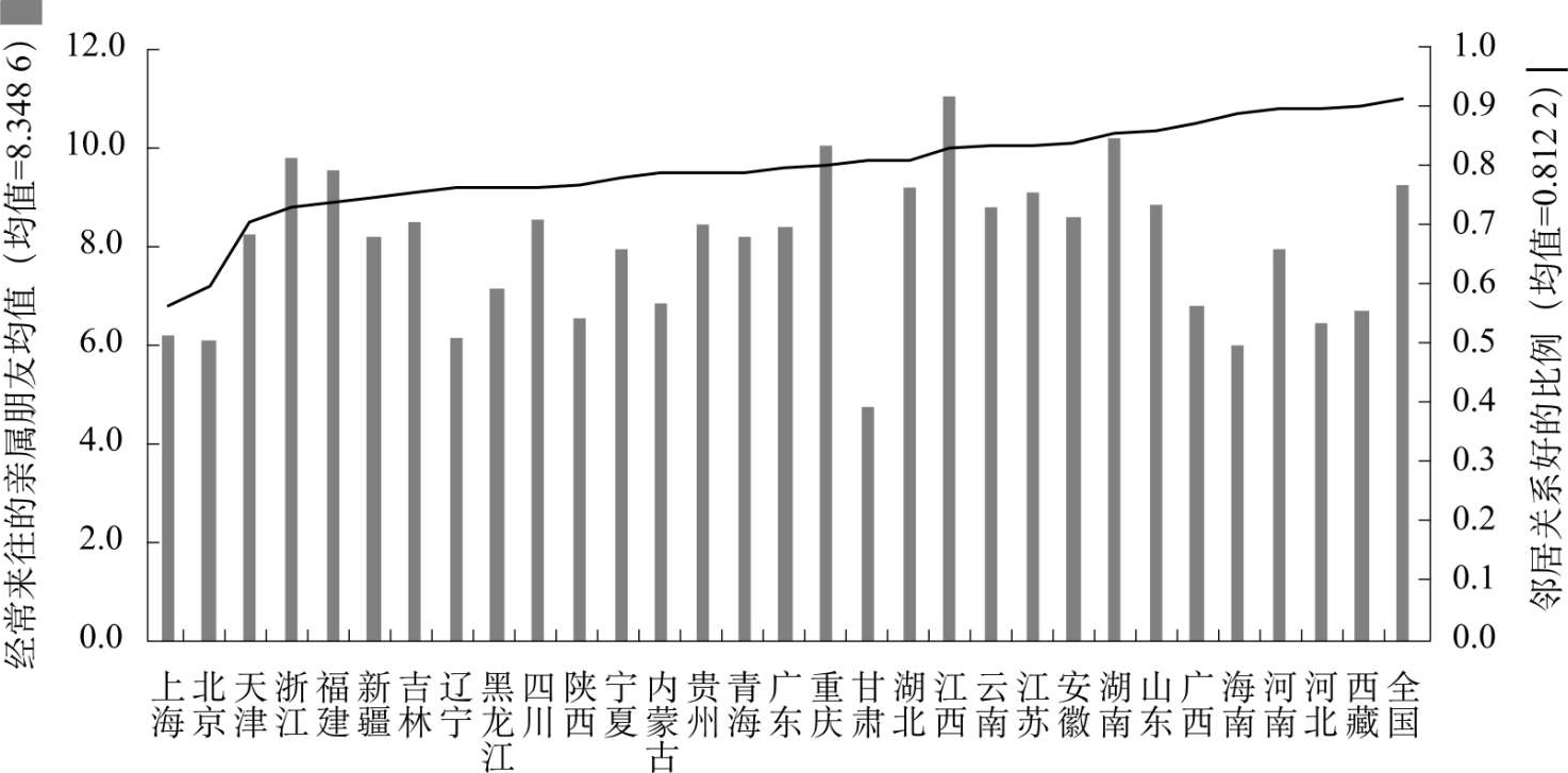 研究发现农村地区老龄人口心情得分均值低于城市地区,这可能与农村地区物质生活和文化生活相对匮乏有关系,因此农村地区应加强老龄人口的社会参与,丰富老年人的物质生活与精神生活。在衡量人际信任的三个指标中,城市人口觉得子女孝顺的比例和经常来往的亲属朋友均值均高于农村地区,邻居关系好的比例则是农村地区较高。由于农村地区物质文化生活相对匮乏,因此子女的经济支持和精神慰藉对于农村老龄人口尤为重要。农村地区可以通过道德引领、村规民俗约束等方式推进“子女尽责、集体担责、社会分责、政府负责”的养老保障格局,提高农村地区老龄人口的人际信任感。