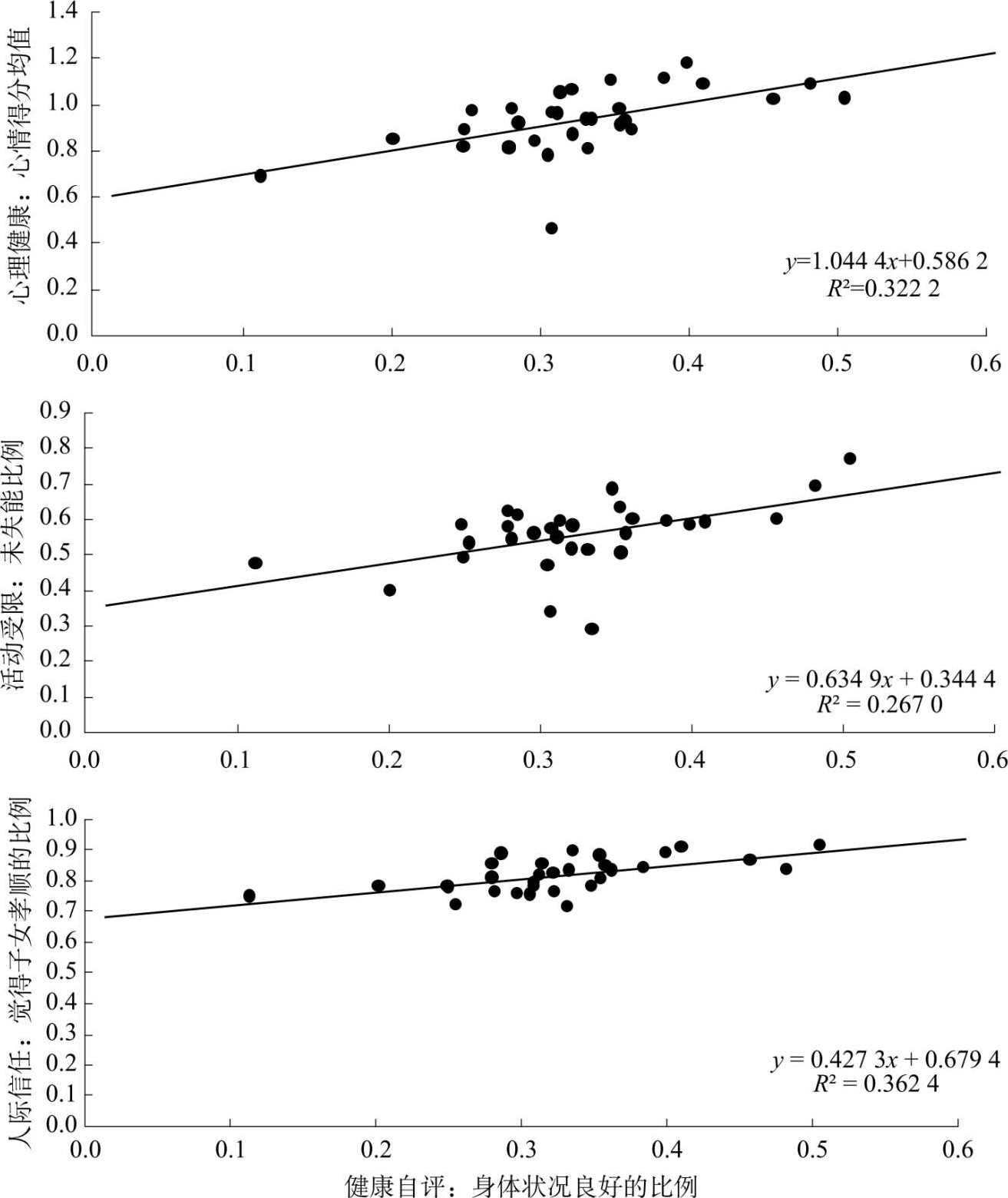 图2-4分别对心理健康、活动受限及人际信任与健康自评的相关性进行了分析。