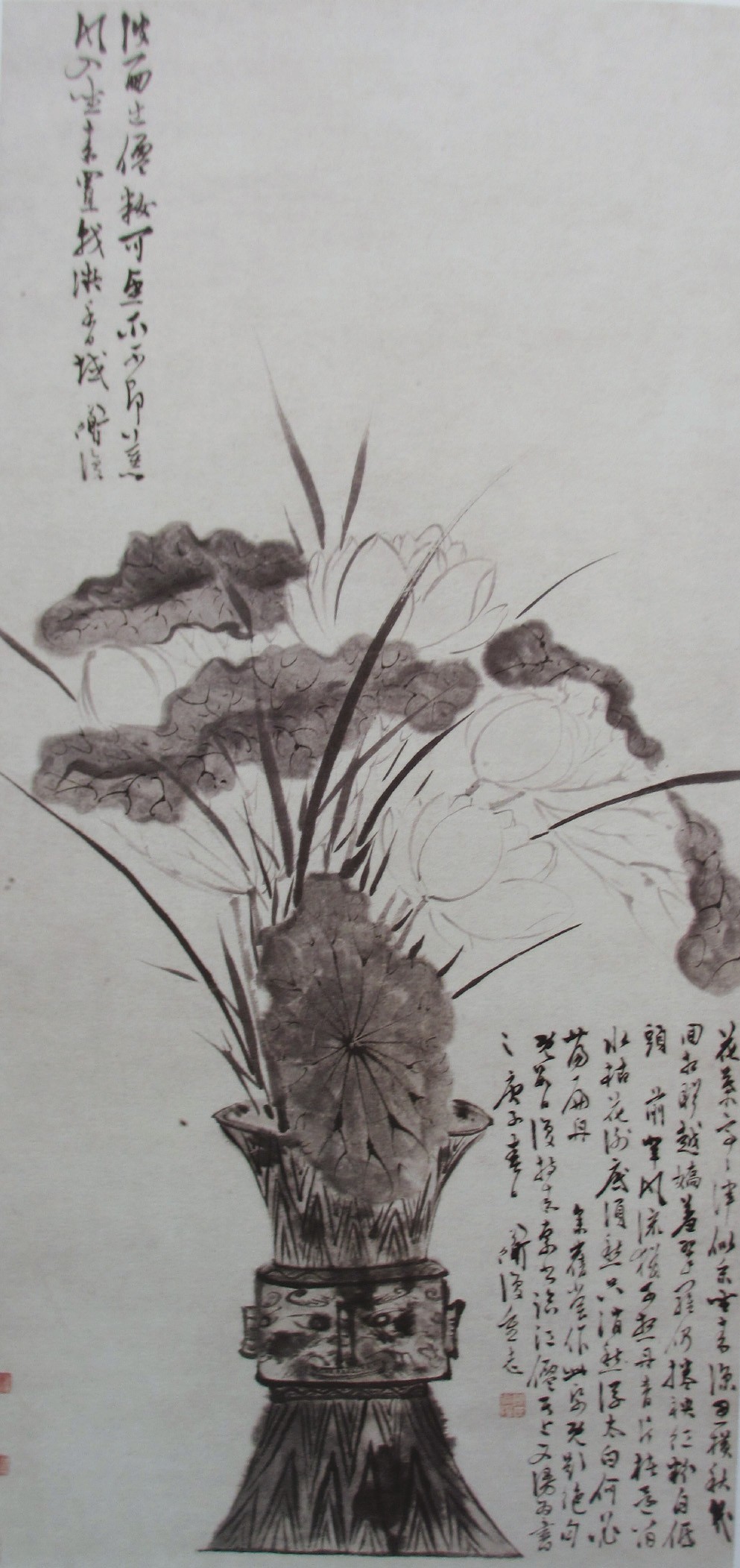瓶莲之作在花鸟画中很平常,白阳此画却很有特点。这幅画重在表达画家坐拥香城的理想,如佛教《维摩诘经》所表现的众香界。