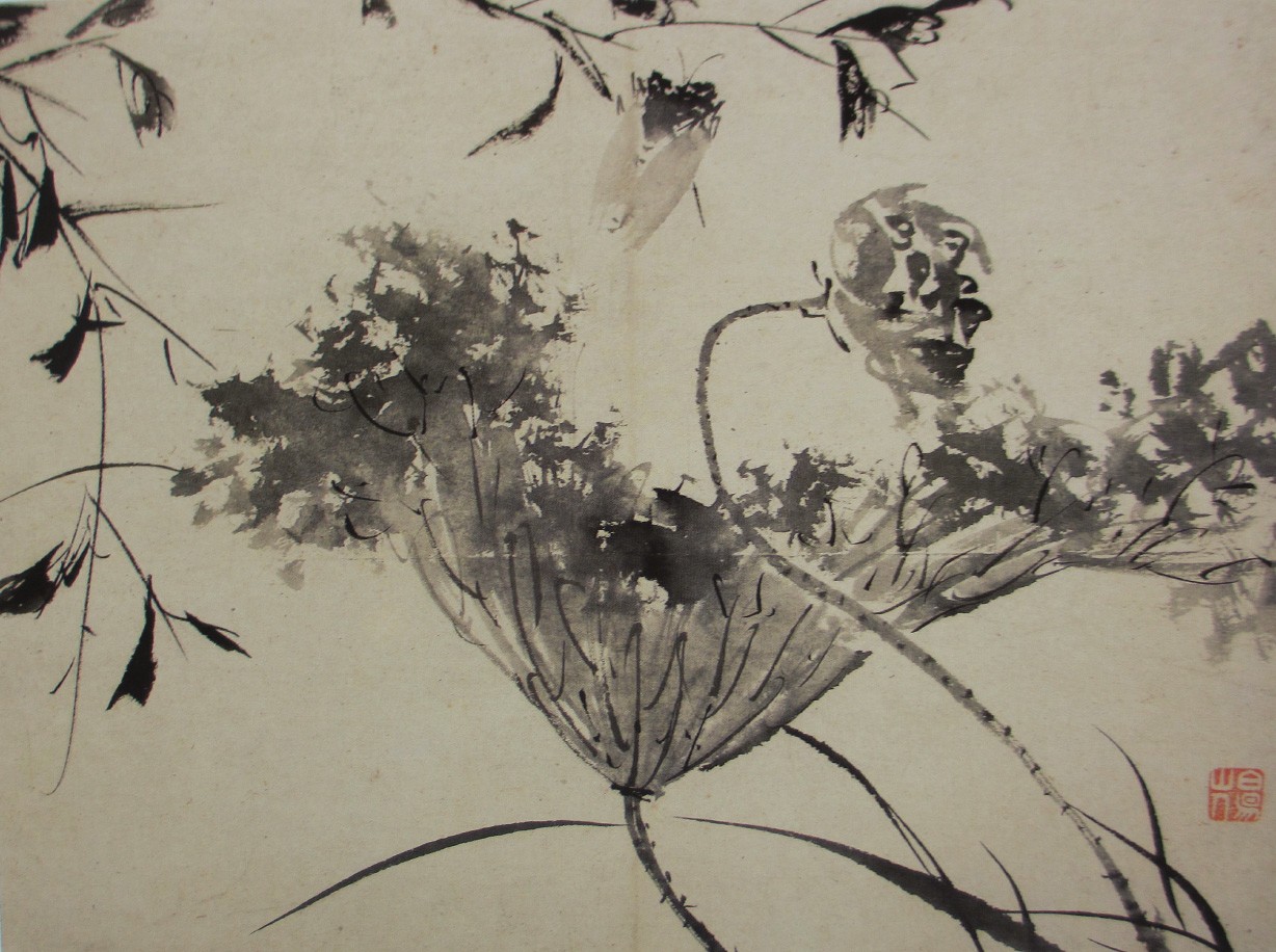 这幅画占画面大部的是一片枯荷,从右侧伸来,却如河面中迅疾漂来的轻舟。枯荷的碎影以淡墨恣肆地戳出,再以稍浓而水分稍少的笔致勾出荷叶的经络。一枝老莲也从右侧而至,似与荷叶嬉戏。画面上侧树叶尖上卧着一只寒蝉,极尽形象,正有白阳“一编读罢倚藤枕,静听玄蝉起夕阳”的风味。整个画面于衰朽中出活络,淡逸中写天真。