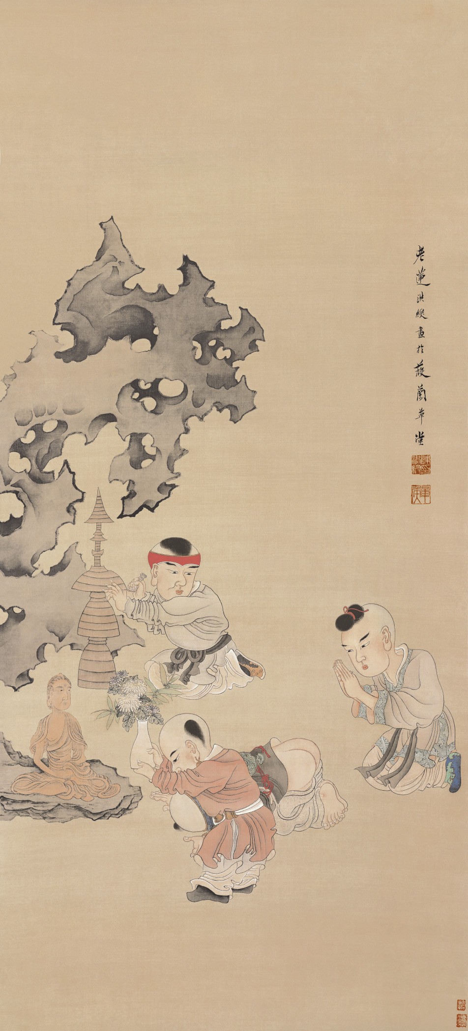 《婴戏图轴》,纸本设色,纵150厘米,横67.3厘米,作于清顺治七年(1650年),藏于北京故宫博物院。画上题:“老莲洪绶画于护兰草堂。”