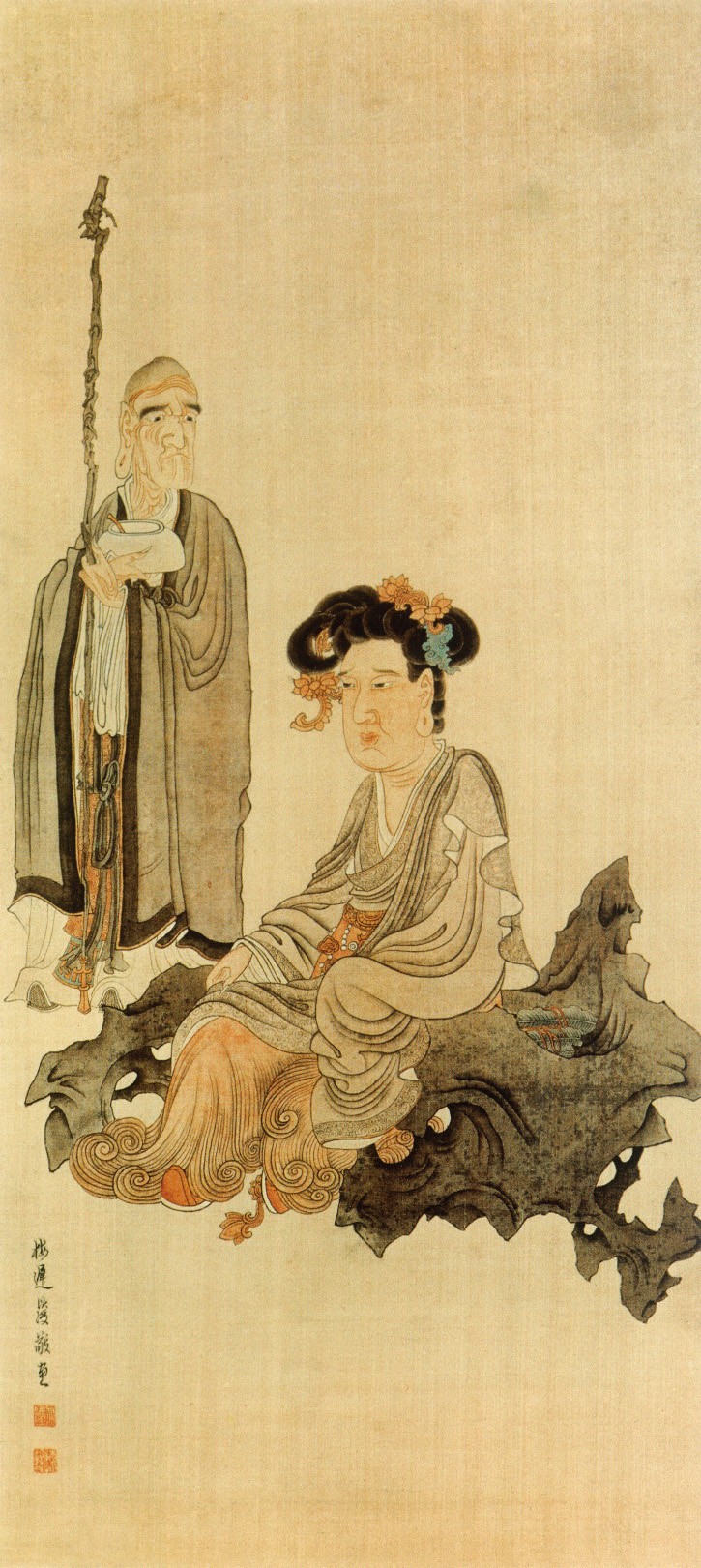 他的《观音罗汉图》,画一个丑观音,一个怪罗汉,可谓丑与怪的结合。中国自六朝以来有长期的观音崇拜,为了表现其柔美、善良、慈爱、宽容、拯救人类苦难的神性,艺术家笔下的观音图像渐渐有女性化、美貌化的倾向,使其成为美的化身。老莲笔下的观音却是道地的丑观音,不合比例的身体,硕大的面部,古怪的神情,坐在一块冰冷的大石头之上,完全超出了人们的视觉经验,强化了高古的气氛。