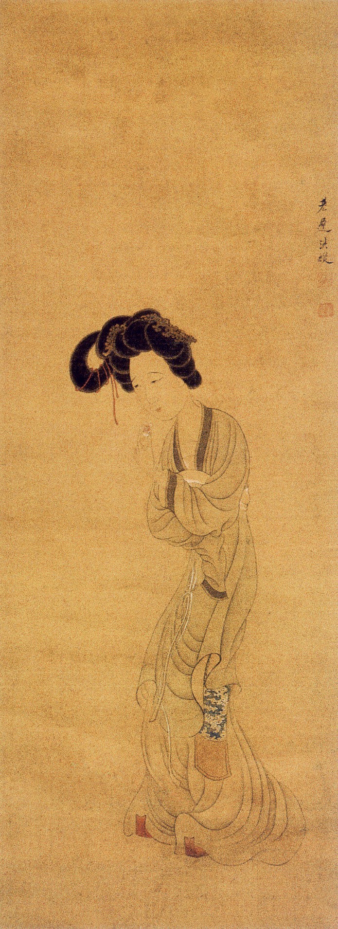 老莲的仕女画深受周昉、张萱等的影响,在线条的描绘和设色方面都不让周、张,而在用意上更胜一筹。周、张的仕女画多画宫中女子的慵懒无聊和寂寞(如周昉的《簪花仕女图》),而陈的《拈花图轴》,多了一份生命的咏叹,在艳丽的气氛中有生命的寄托。
