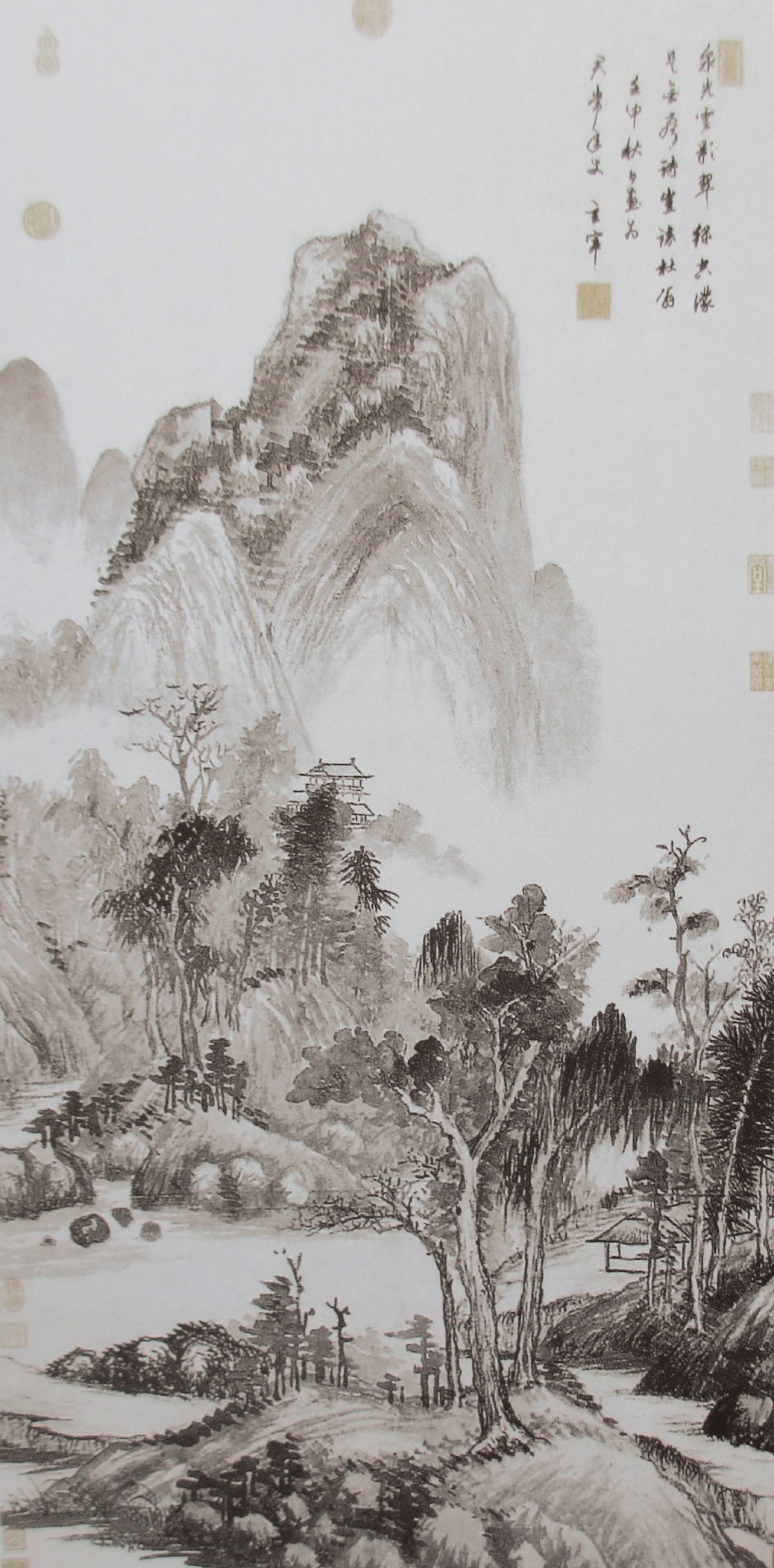 《泉光云影图轴》,纸本墨笔,纵127.8厘米,横63.9厘米,作于明崇祯五年(1632年),中国台北故宫博物院藏,有题云:“泉光云影,翠绿空蒙,是无声诗,岂怀杜翁。”
