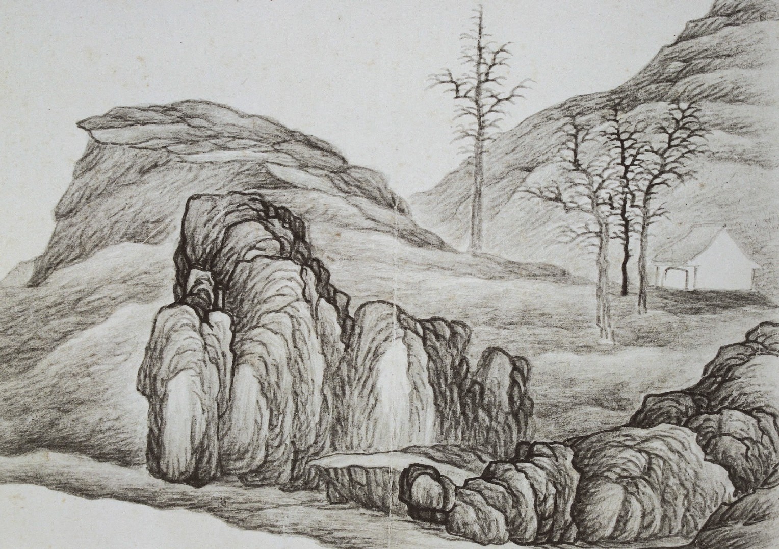 这幅《村居图页》画山村之景,但不是山村篱落、溪桥柳色,初见使人洞心骇目。四棵枯树当风而立,树下约略画一茅舍,即所谓村居。溪涧旁的山石以小披麻兼荷叶卷云皴画出,如卷云腾挪,给人深邃幽寂的感觉。这套册页中的一幅画空亭,题有一诗:“一角小重山,几簇荒寒树。此际寂无人,谁领闲中趣?”《村居图页》也是如此,这是永恒寂寥的山水,充满了神秘感。