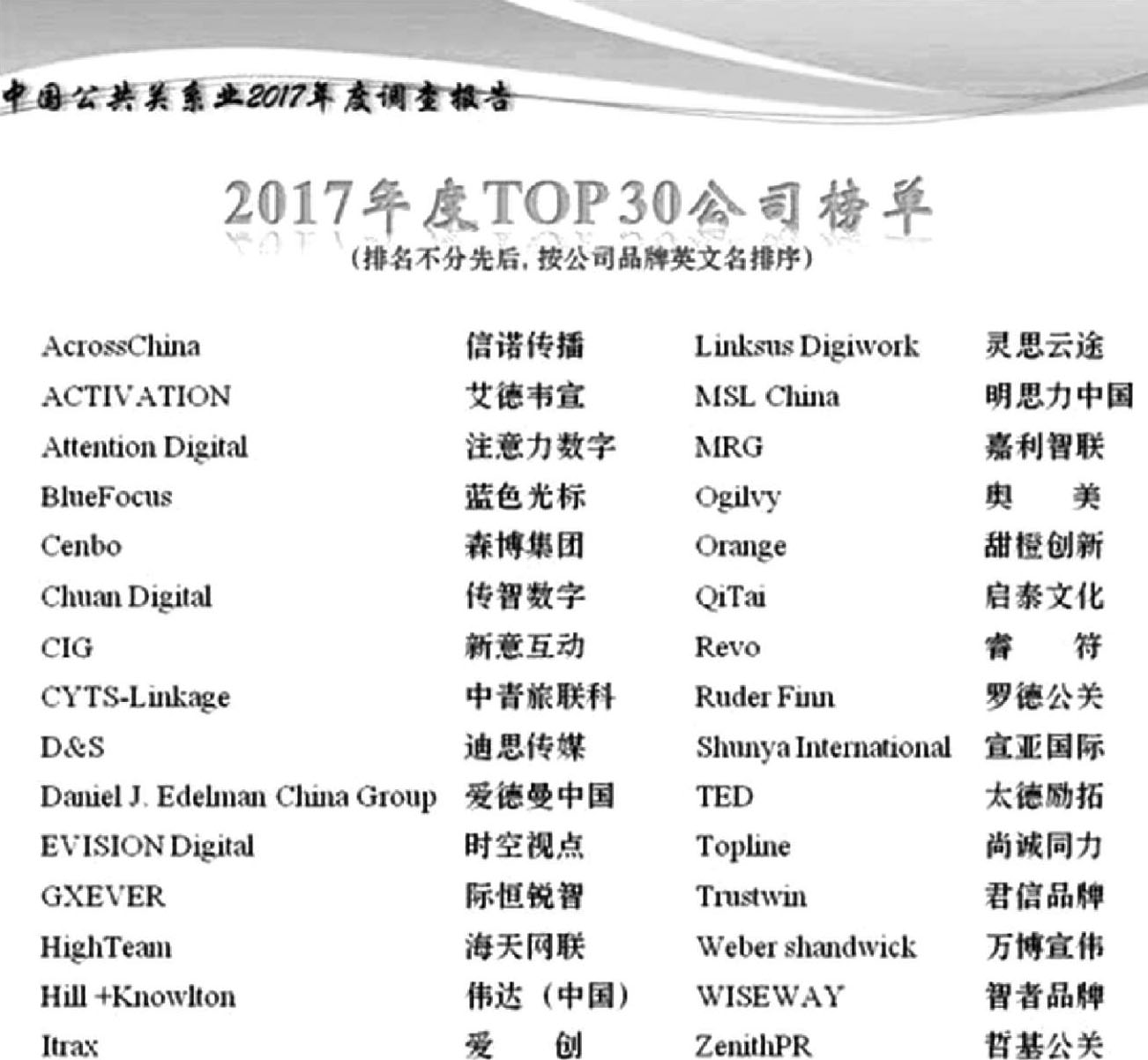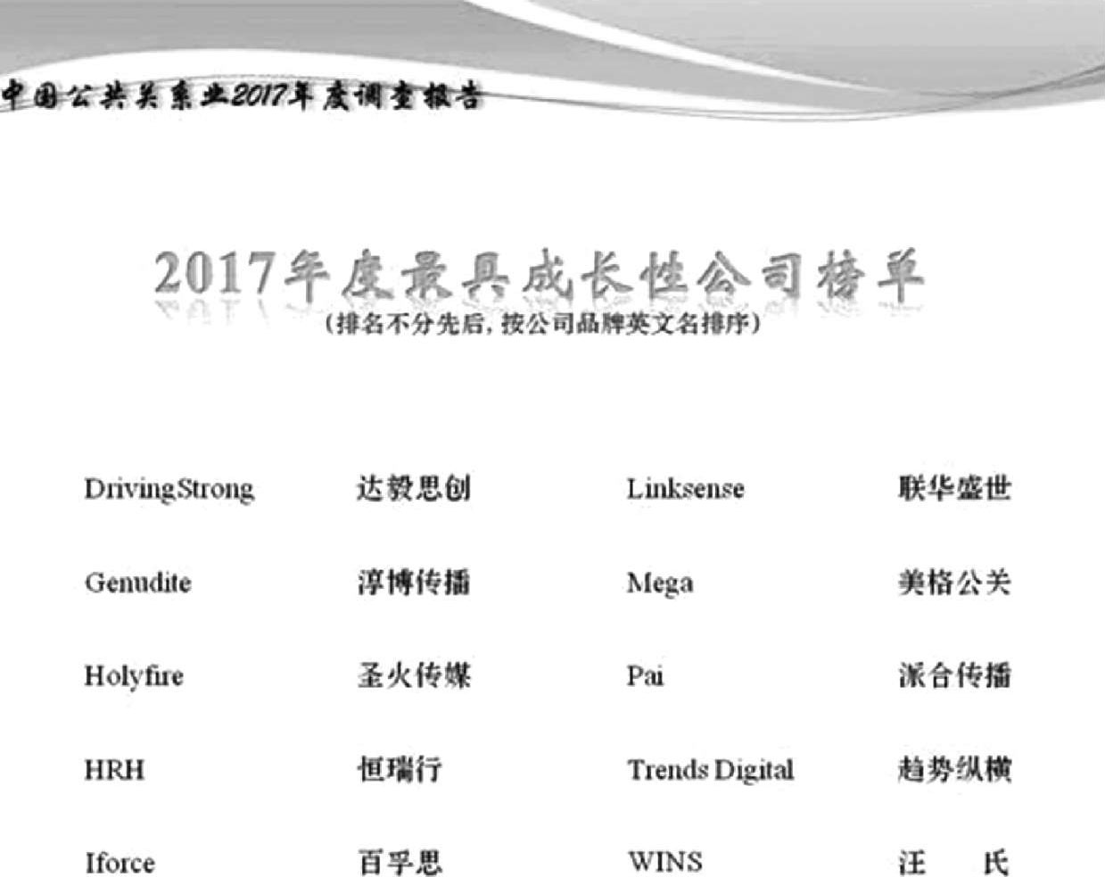 榜单统计分析由CIPRA研究发展部执行,CIPRA公关公司工作委员会常委会审议。2017年度TOP 30公司榜单与 2017年度最具成长性公司榜单分别如图 1-1、图 1-2所示。