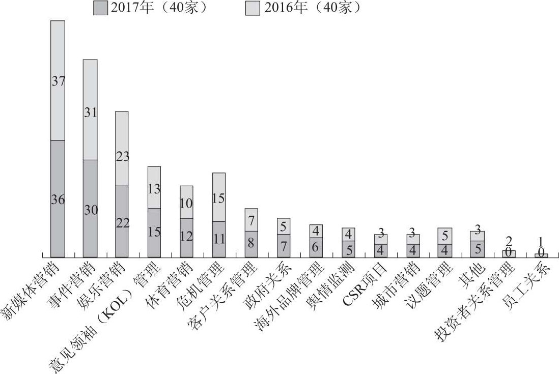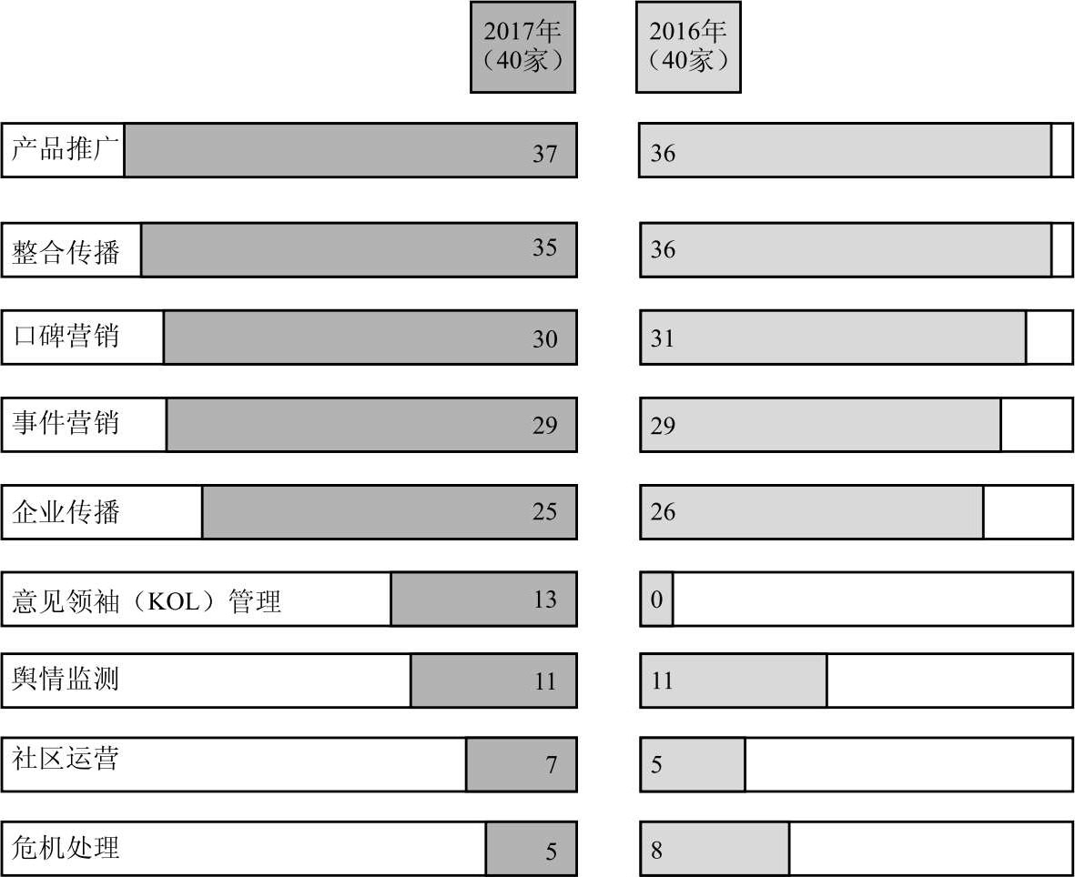 ③新服务手段方面,绝大多数公司在新媒体营销(网络公关、社交媒体等)、事件营销、意见领袖(KOL)管理、娱乐营销、危机管理方面实现较快发展。