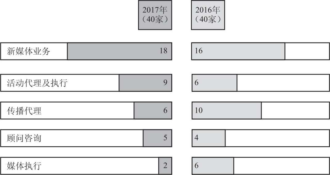 40家公司中,18家以新媒体业务为主,9家以活动代理及执行为主,6家以传播代理为主,5家以顾问咨询为主,2家以媒体执行为主。新媒体业务、活动代理及执行、传播代理,依然是本年度公关市场的主要三大业务类型,2017年行业市场份额与 2017年行业市场份额业务潜力市场构成(公司数)分别如图 1-5、图 1-6所示。