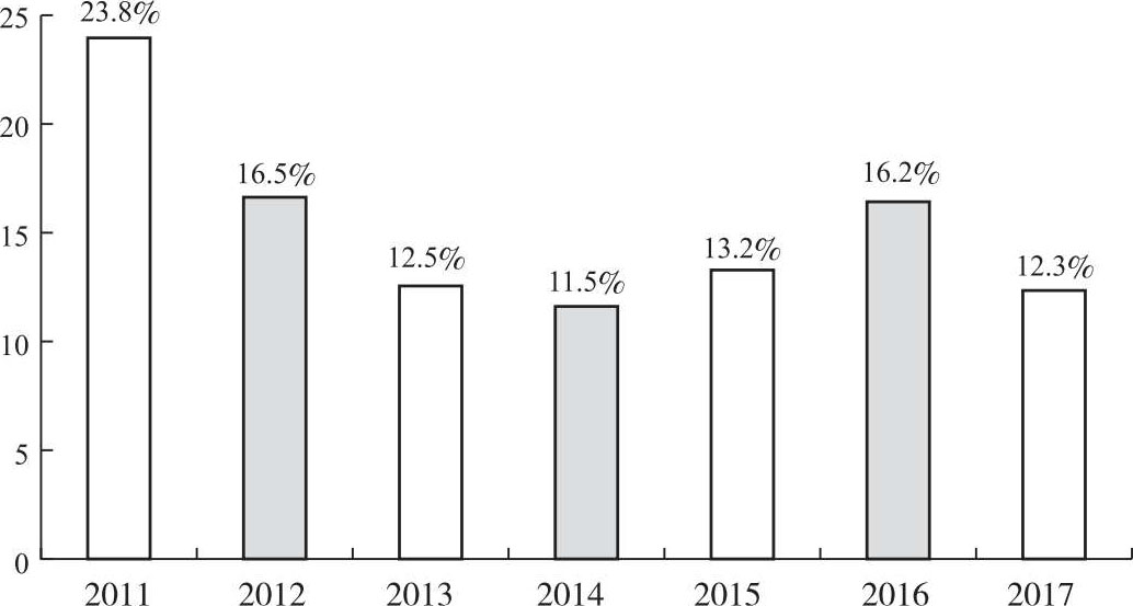 (6)政府机构购买公共关系服务的趋势开始显现,为行业增长开辟了新的领域。近年来,政府部门对公共关系越来越重视,相关机构购买公关服务的趋势开始显现。公共关系领域年度营业额变化趋势与年增长率变化趋势分别如图 1-3、图 1-4所示。