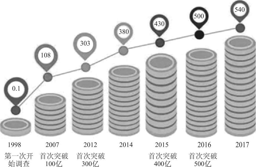 图 1-3 公共关系领域年度营业额变化趋势(亿元)
