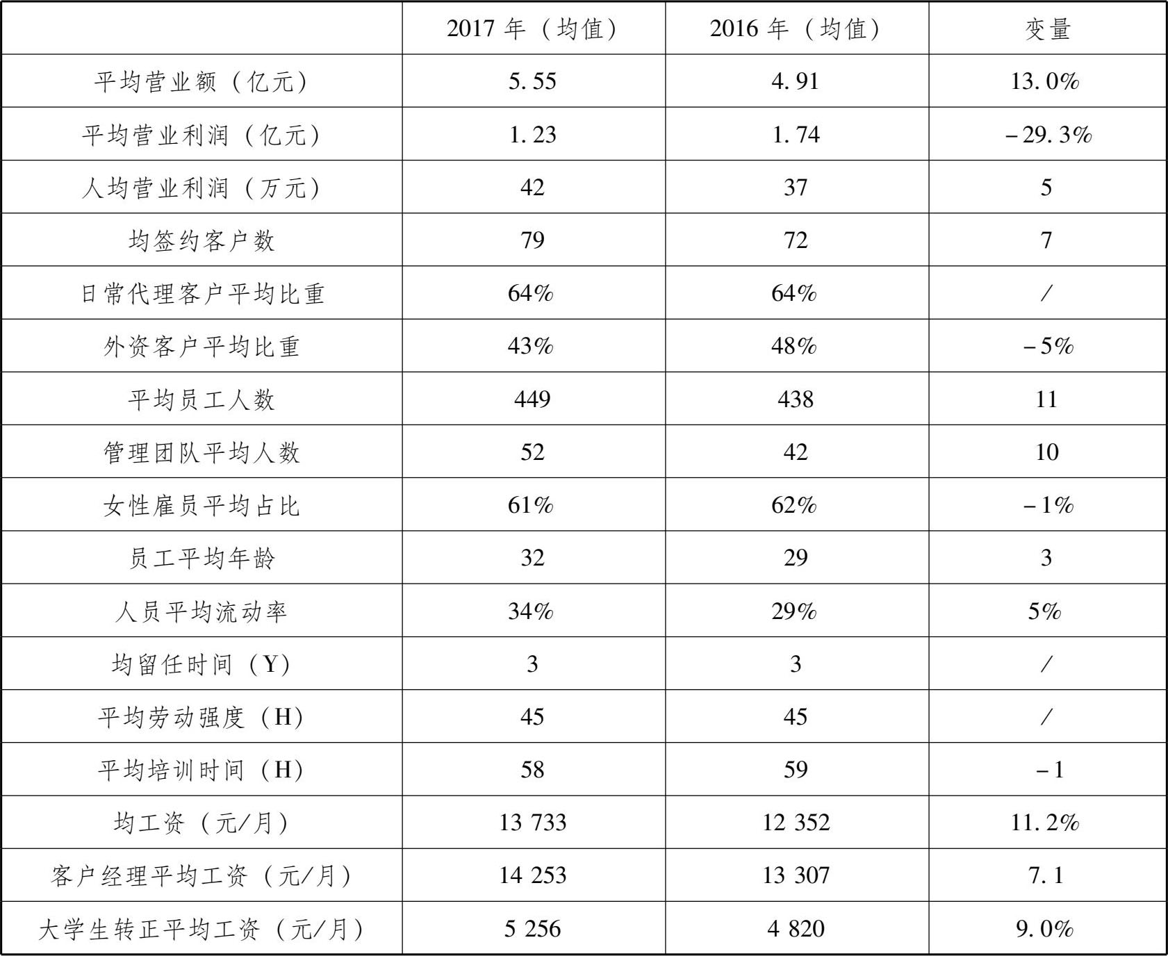 ④年平均工资水平为 13 733元/月,比上年同期增长 11.2%;客户经理平均月薪为14 253元,比上年同期增长 7.1%;大学生转正平均月薪为 5 256元,比上年同期增长9.0%,人员成本逐年增加,这是公共关系行业的一个明显趋势。TOP公司营业情况与运营管理统计如表 1-2所示。