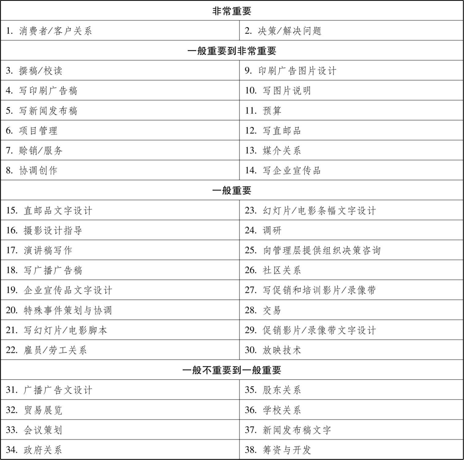 公共关系工作中雇主强调的知识/技能领域及排序如表 2-2所示。