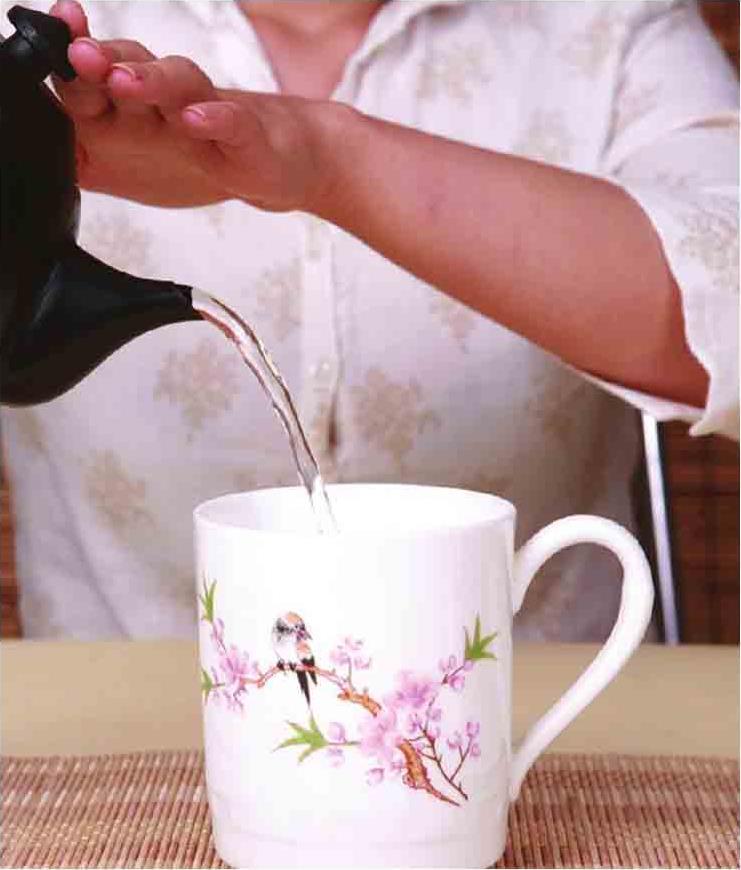 冲泡:加水到杯子的2/3处,七分满,花茶、普洱、乌龙茶需加盖,绿茶、白茶、红茶、黄茶不需加盖。