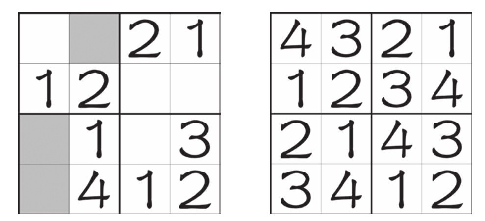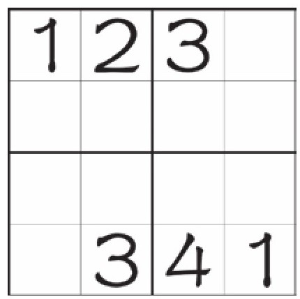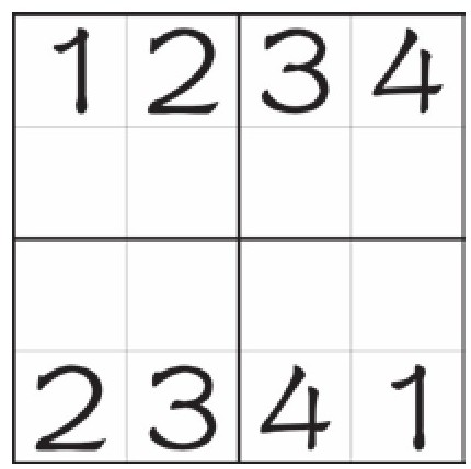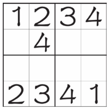 四阶标准数独规则:填入1~4,使每行、列、宫内,都是数字1~4,且不重复。
