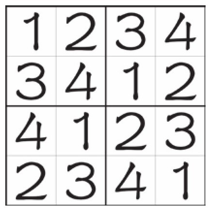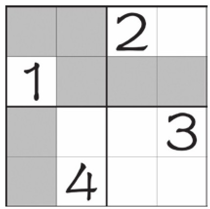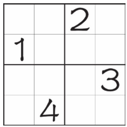 四阶标准数独规则:填入1~4,使每行、列、宫内,都是数字1~4不重复。