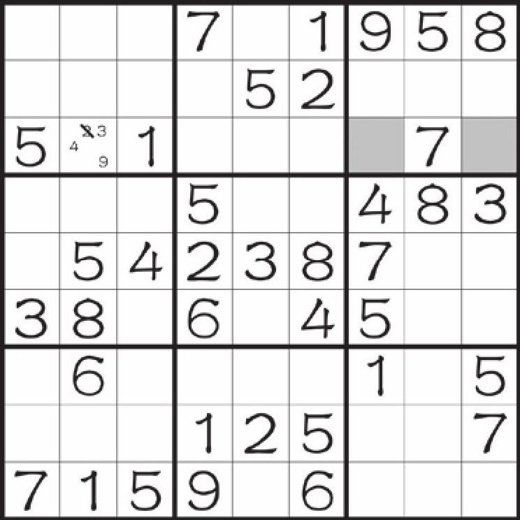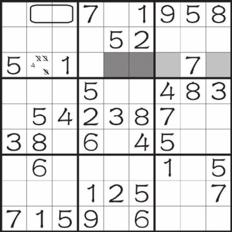 这道题中,我们利用了很多个区块对同一个格子进行了观察。C2的候选数是2、3、4、9,其中第三宫的2区块能删减数字2,第二宫的9区块能删减数字9,第一行的3区块能删减数字3,得到C2=4。一般来说,区块都是由同一行/列中同宫的部分构成,在宫内作删减,或由宫内同一行列的部分构成,在这个行列里作删减。得到C2=4后,我们就能很简单地解开此题。