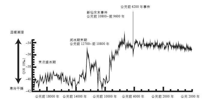 地球的运行轨道变化使得气候冷热交替,收成时好时坏。图2-1显示了南极冰芯氧同位素的比例如何随着气候的变化而变化。直到公元前14000年之后——此时融化的冰川不再把冰冷的水注入海洋中——世界才开始逐渐变暖。公元前12700年左右,气候变暖的速度加快,在短短的时间里,地球的温度就上升了5华氏度左右,直到变成现在的温度。