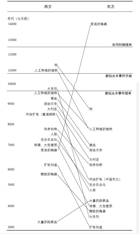 第二,东西方发生的事情不仅相似,而且发生的先后顺序也差不多。我已在表2-1中用连线表示。图中大部分直线的斜度都是差不多的。西方先开始发展,大约2000年后,东方也开始发展。这有力地表明了东西方的发展遵循同一个文化逻辑,在欧亚大陆的两端,同样的原因产生同样的结果。唯一的区别在于西方比东方早2000年开始这个过程。